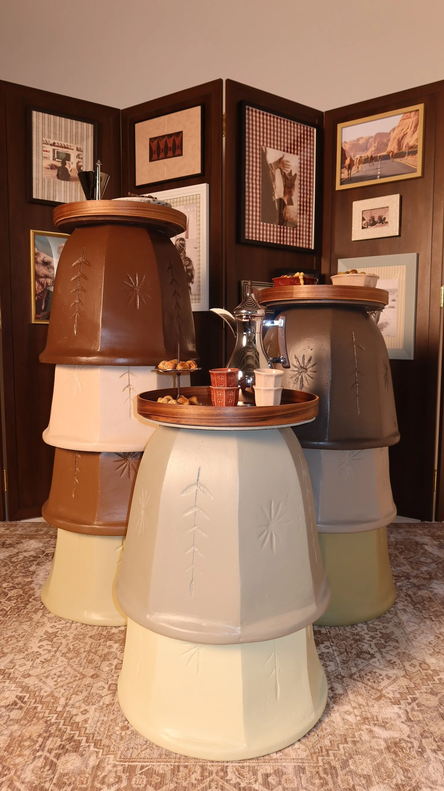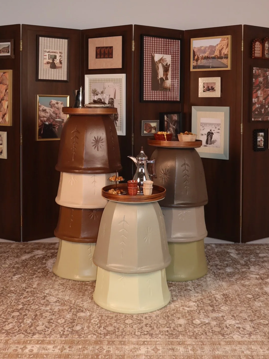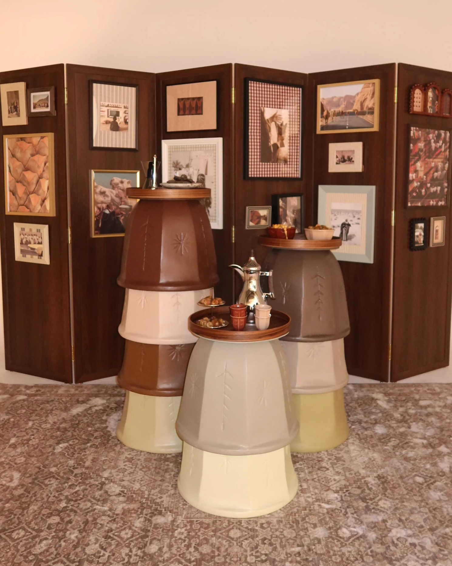 Each set includes a traditional rug, a wooden partition with finely curated frames, three custom-designed tables, and thoughtfully selected table accessories to complete the gathering. (Entire setup dimension: 3 x 2 m)