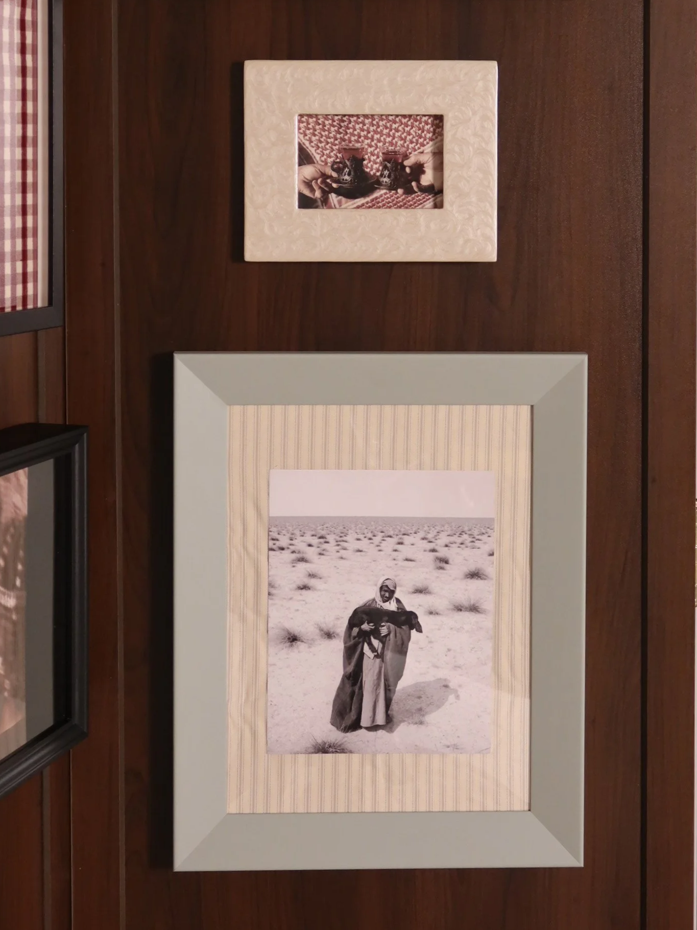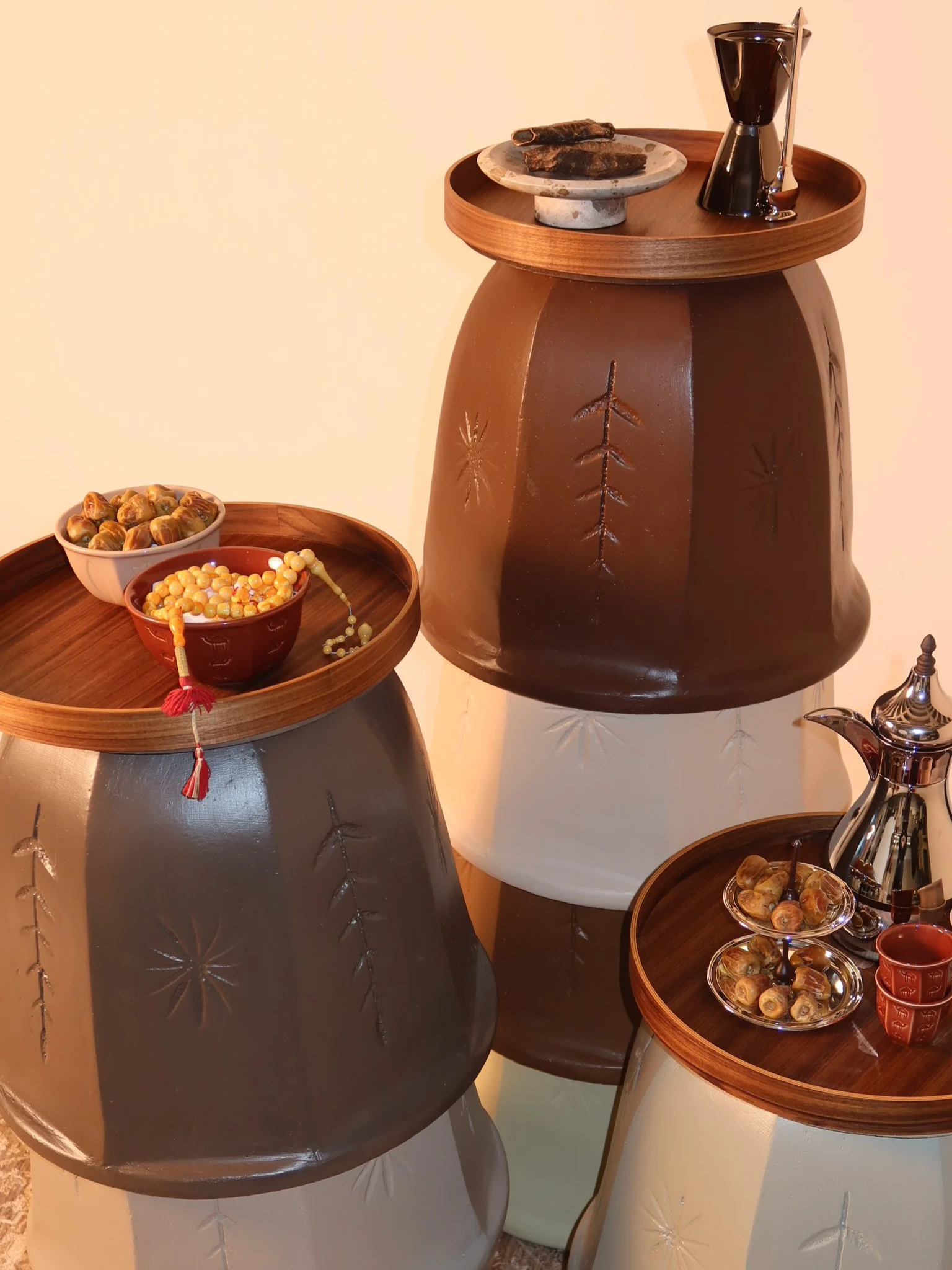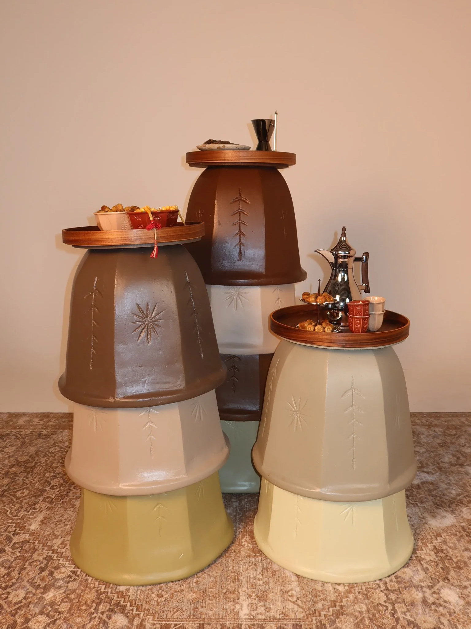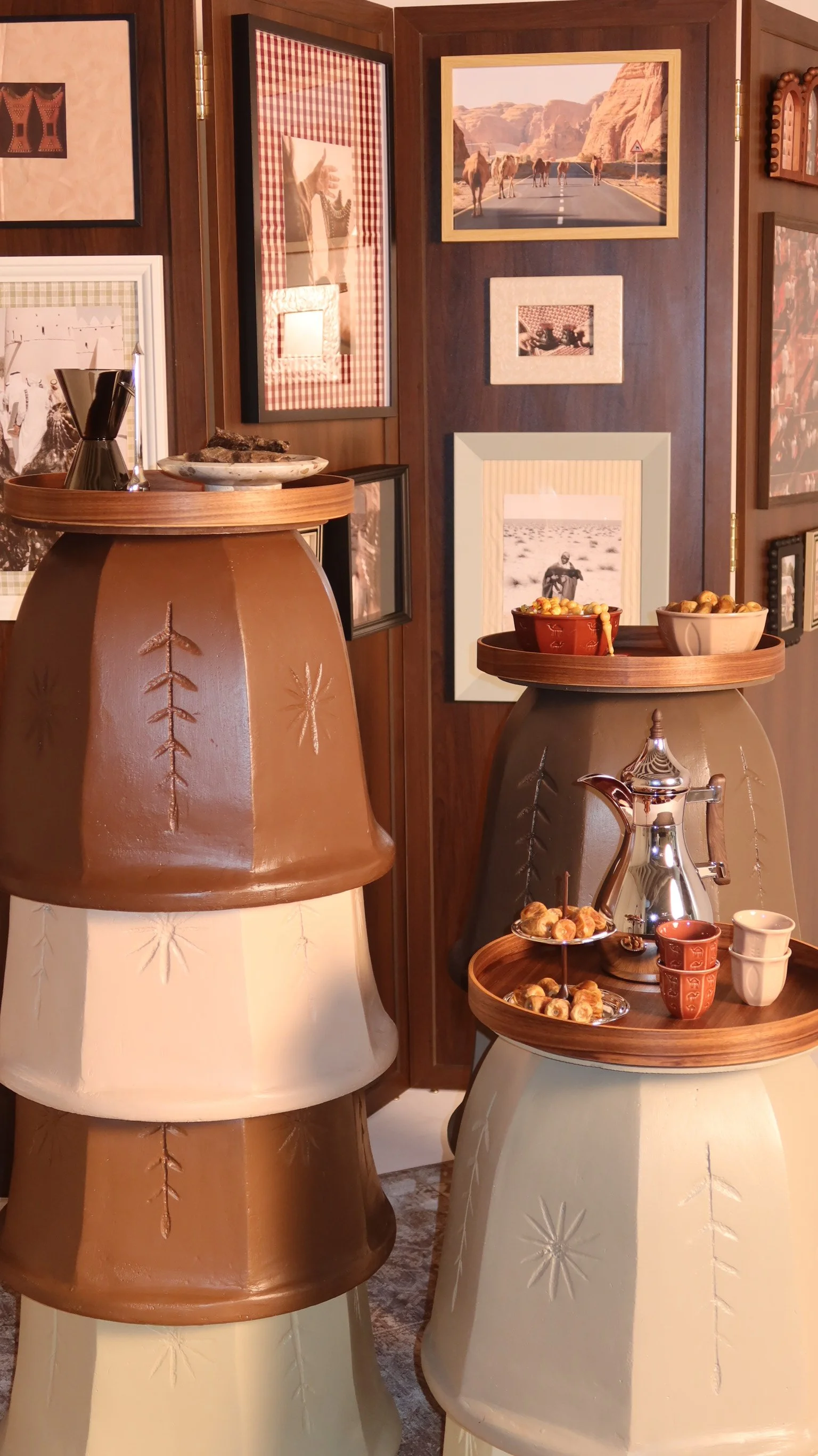 Each set includes a traditional rug, a wooden partition with finely curated frames, three custom-designed tables, and thoughtfully selected table accessories to complete the gathering. (Entire setup dimension: 3 x 2 m)